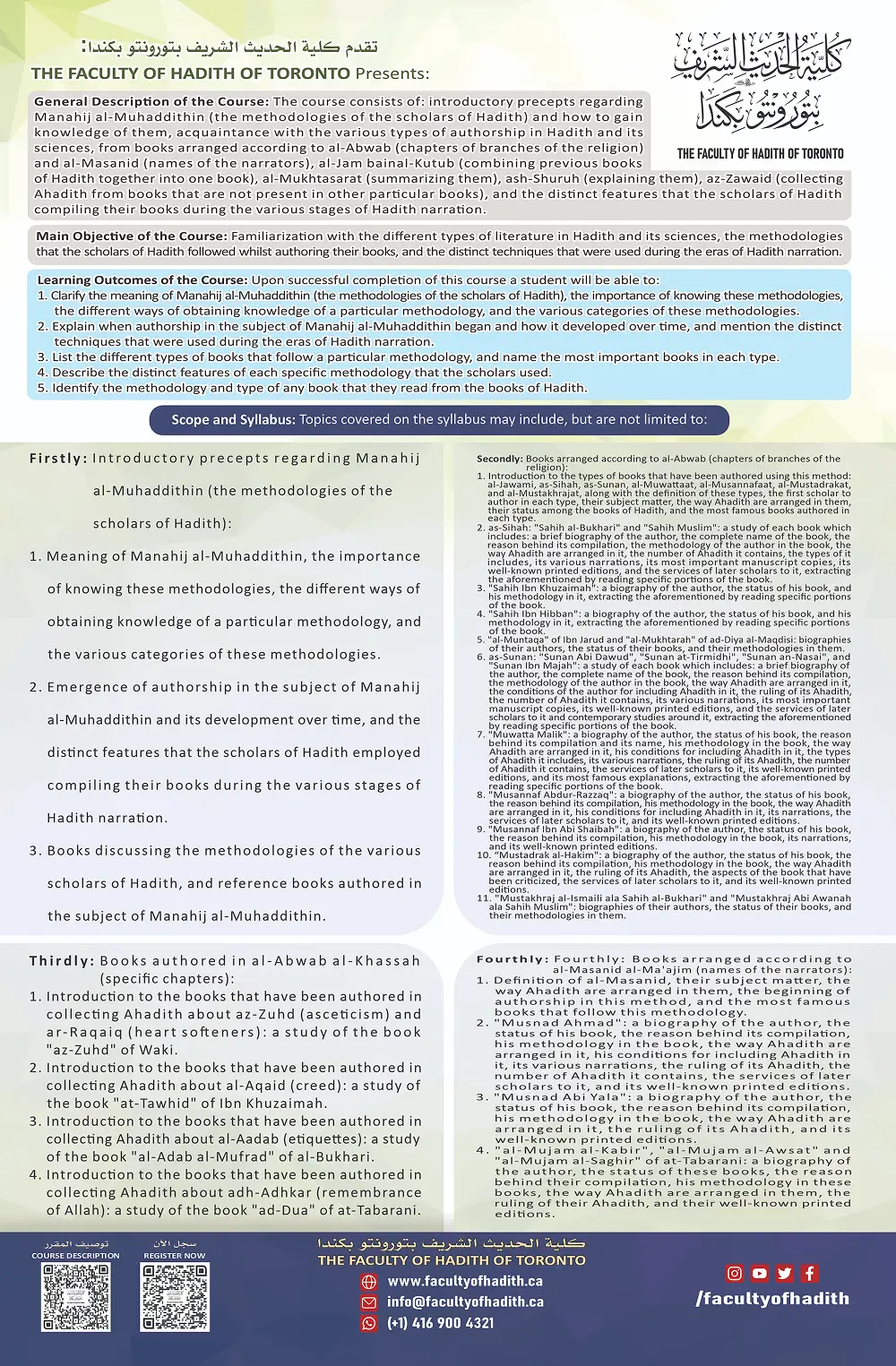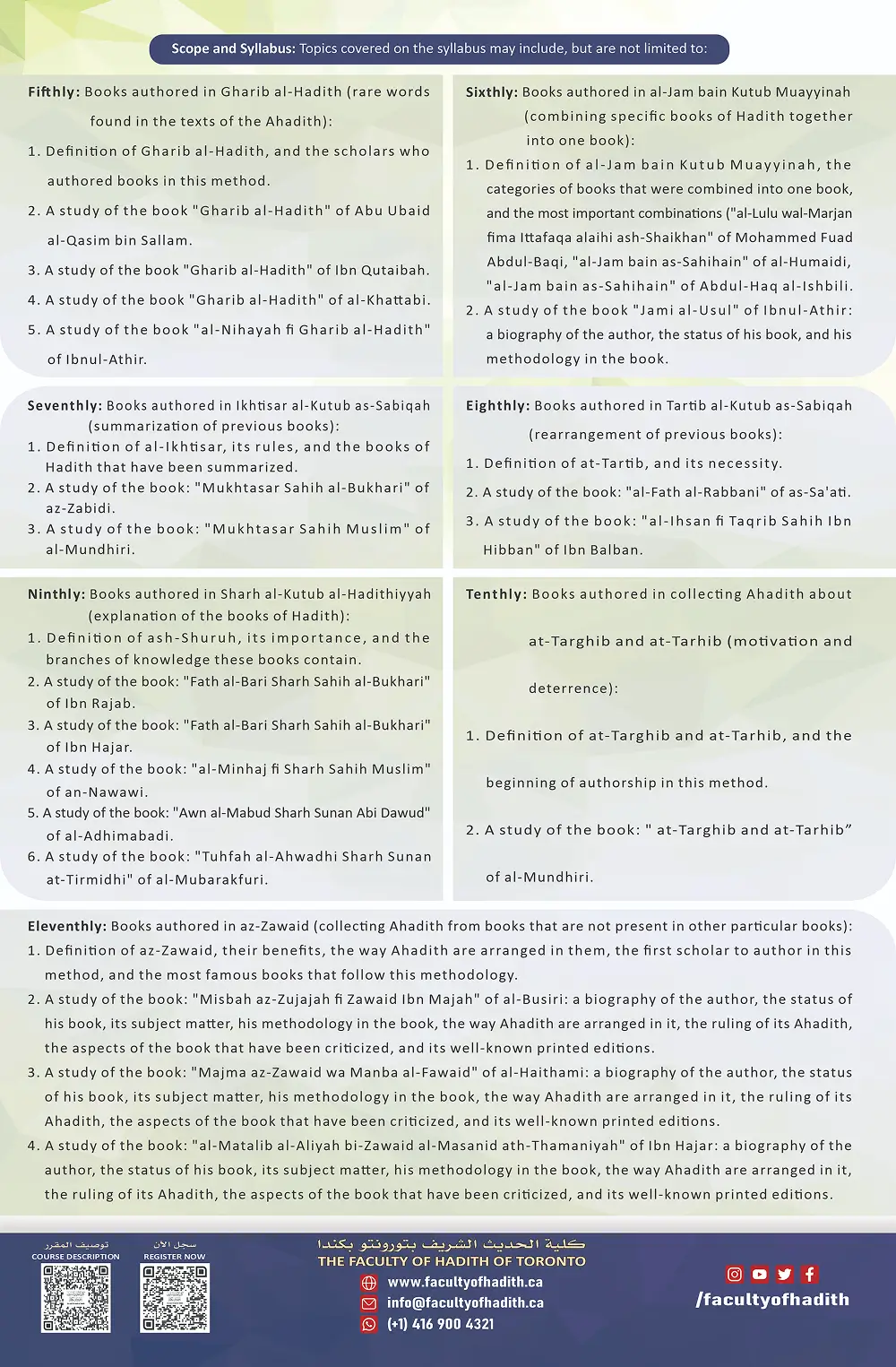 General Description of the Course: The course consists of: introductory precepts regarding Manahij al-Muhaddithin (the methodologies of the scholars of Hadith) and how to gain knowledge of them, acquaintance with the various types of authorship in Hadith and its sciences, from books arranged according to al-Abwab (chapters of branches of the religion) and al-Masanid (names of the narrators), al-Jam bainal-Kutub (combining previous books of Hadith together into one book), al-Mukhtasarat (summarizing them), ash-Shuruh (explaining them), az-Zawaid (collecting Ahadith from books that are not present in other particular books), and the distinct features that the scholars of Hadith employed compiling their books during the various stages of Hadith narration.